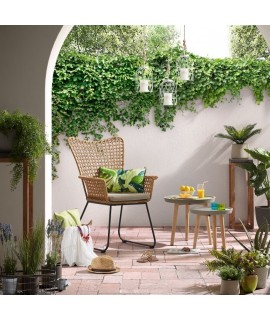 Lovely round coffee table with a base made of three feet of natural acacia wood and polychrome top, suitable for indoor and outdoor use.