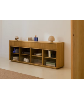 Refined sideboard, each piece is a work of craftsmanship. Made with 4 sliding doors and 4 drawers with pressure opening and soft closing system and adjustable shelves to adapt the storage space. Structure in oak veneer and tempered glass. Certified wood, made with a mix of materials from certified forests and controlled wood. Equipped with adjustable feet to correct any irregularities in the floor. Below you will find the accessories of the same line to match. All measurements are in the photo of the technical sheet.