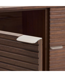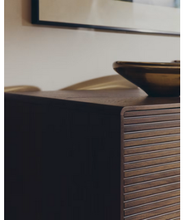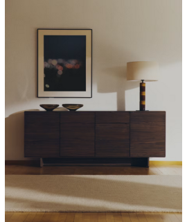 To complement a unique and striking piece, here's an elegant and refined sideboard, with a minimalist look that perfectly meets today's furnishing needs. Featuring a walnut veneer structure, it has a polyurethane varnish finish, ensuring resistance to wear and moisture. It features four doors with soft-close hinges and two drawers with concealed runners and a handle-operated opening system with soft-close. The handles are made of stainless steel with a satin-brushed finish, which reduces the visibility of fingerprints and scratches, and feature a slanted design for a better grip. The internal shelves are adjustable. The wood is certified from managed forests. Below are matching accessories from the same line. All measurements are shown in the technical data sheet photo.