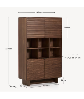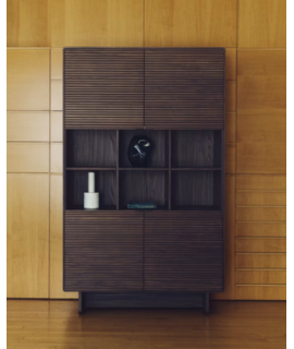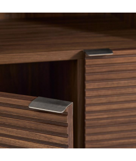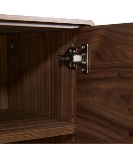 To complement a unique and striking piece, here's an elegant and refined sideboard, with a minimalist look that perfectly meets today's furnishing needs. Featuring a walnut veneer structure, it has a polyurethane varnish finish, ensuring resistance to wear and moisture. It features four doors with soft-close hinges with concealed runners and a handle-operated opening system with soft-close. The handles are made of stainless steel with a satin-brushed finish, which reduces the visibility of fingerprints and scratches, and feature a slanted design for a better grip. The internal shelves are adjustable. The wood is certified from managed forests. Below are matching accessories from the same line. All measurements are shown in the technical data sheet photo.
