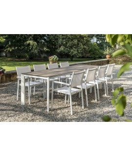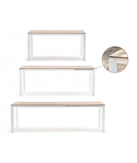 Extendable table with telescopic opening. Structure in white painted aluminum and top in HPL, a material very resistant to external agents, scratches and heat, available in the following colors: wood, concrete or white. Ideal for your outdoor spaces, garden or terraces. A clean and refined line. Below you will find chairs to match the same line.