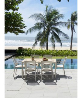 A fresh line, which brings refinement and prestige to your outdoor environment, comfortable and weatherproof. Set consisting of a fixed table and 6 stackable chairs. The table is made with white painted aluminum structure and teak wood top. Slatted top and removable legs. The chairs are in white aluminum with finishes on the armrests in teak wood and a seat cushion in sand-colored water repellent fabric. Screws in stainless steel. Aluminum has the characteristic of high resistance. The precious and recognized teak wood for its weathering and UV rays properties. Beautiful, elegant and design. For your outdoor environment, garden or terrace, but also suitable for bars, cafes, residences, restaurants, waterfront establishments, hotels, b & b, beach resorts.