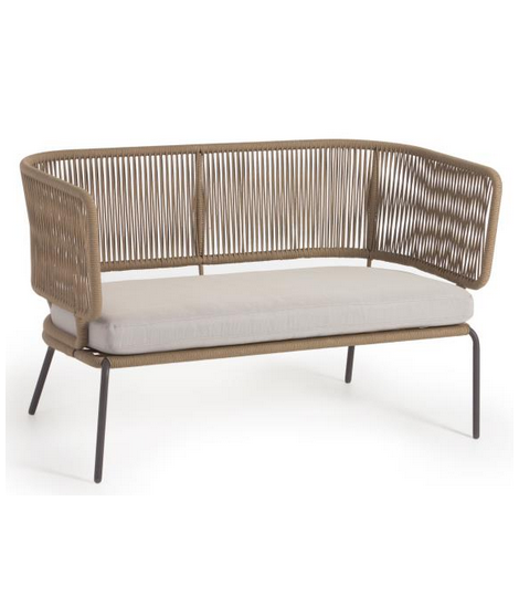 2 seater sofa with a comfortable and practical functionality. Structure in galvanized powder-coated steel and covered in polyester rope resistant to UV rays. Comfortable and beautiful, with a comfortable seat area covered with a beautiful practical and resistant fabric. See below the other accessories to combine with the same line. In the photo of the data sheet all the measures are indicated.