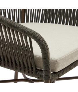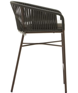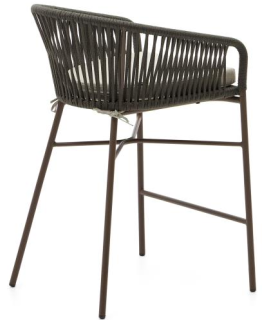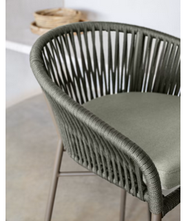 Comfortable stool with armrests, seat height 65 cm, modern and design. The particular processing in polyester rope on a steel structure makes it beautiful and welcoming, as well as being comfortable and practical for outdoor use. UV resistant, available in colors: terracotta, black, beige or dark green. See below all the accessories of the same line to match. In the photo of the technical data sheet all the measures are indicated.