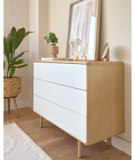 Beautiful and refined chest of drawers with structure in solid ash wood, with 3 drawers in ash veneer with pressure opening, grayish white lacquered front and solid wood feet equipped with plastic grommets to protect the floor. When utility and good taste come together and give life to a beautiful and practical chest of drawers. Under the accessories of the same line to match. All measurements are in the photo of the data sheet.