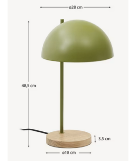 Beautiful and delicious table lamp, made in green metal and ash wood. Suitable for the living room, study or bedroom. Prepared for a large E27 socket lamp (not included), with low consumption or energy saving, LED or incandescent. In the photo of the technical sheet there are all the measures. Below you will find the other complements of the same line to match.