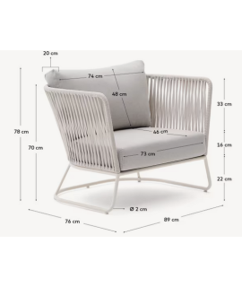 Pleasant armchair for outdoor, modern and design, sober and fanciful. The particular processing in polyester rope on a painted steel structure makes it beautiful and resistant. In the photo of the technical data sheet all the measures are indicated. Below you will find other accessories from the same line.
