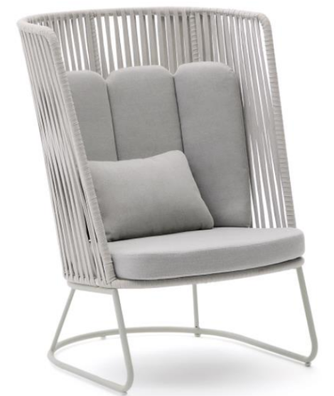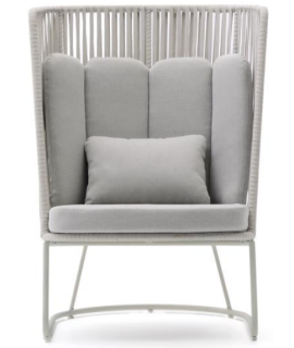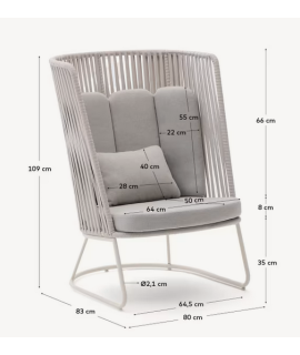Pleasant armchair for outdoor, modern and design, sober and fanciful. The particular processing in polyester rope on a painted steel structure makes it beautiful and resistant. In the photo of the technical data sheet all the measures are indicated. Below you will find other accessories from the same line.