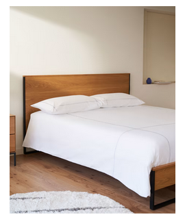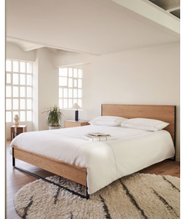 Beautiful and refined double bed complete with slatted base. A very essential line that gives elegance to your furniture. Made of oak veneer and black finish steel legs.