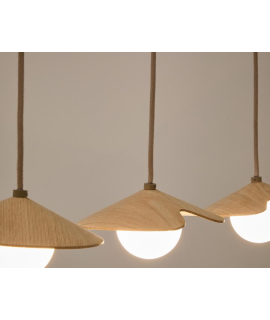 An elegant and refined chandelier in oak veneer with three white smoked glass beads. It illuminates and diffuses light in a surprising way throughout the room. The beautiful lampshade creates a pleasant and intimate effect.