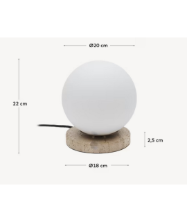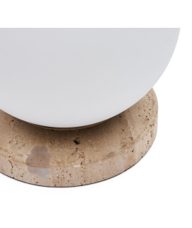 Refined table lamp, stylized, elegant and very functional. With simple and linear structure in travertine and sphere lampshade in frosted glass.