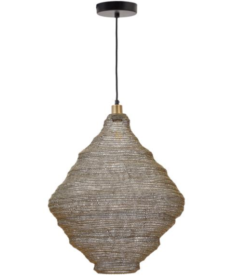 A gold metal ceiling lamp, which provides illumination through an enchanting hand-woven lattice. Perfect for industrial, minimal, Nordic, modern, or vintage styles. Suitable for a large E27 bulb (not included), energy-efficient, LED, or incandescent. Energy efficiency class: A++. All measurements are shown in the technical data sheet photo.