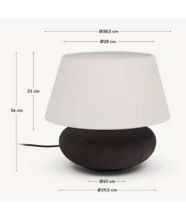 Beautiful and delicious table lamp, made of black terracotta effect metalwith fabric lampshade. Suitable for the living room, study or bedroom. Prepared for a large E27 socket lamp (not included), with low consumption or energy saving, LED or incandescent. Cable length 230cm. In the photo of the technical sheet there are all the measures.
