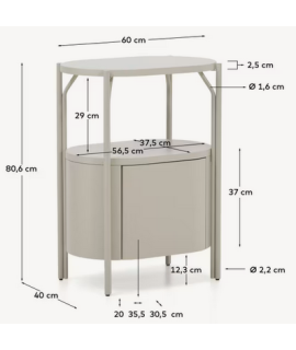 An intriguing and unique piece of furniture. Made of water-repellent lacquered MDF, it features a push-open drawer with soft-close mechanism and adjustable legs for optimal stability. All measurements are shown in the photo in the technical specifications.
