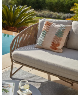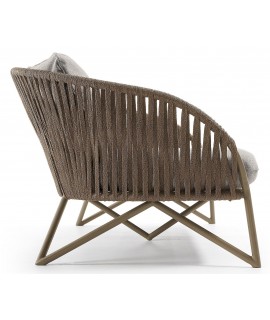 3 seater sofa with comfortable and practical functionality. Structure in brown galvanized powder coated steel and processing of the armrests and backrest in polyester rope resistant to UV rays. Comfortable and well supported, seat and back kitchens covered with a beautiful practical and resistant fabric. See below the armchair to combine with the same line. In the photo of the data sheet there are all the measures.