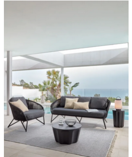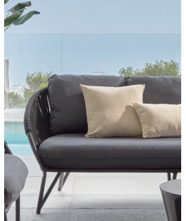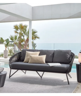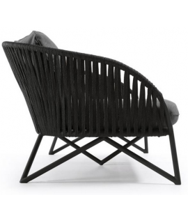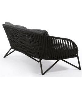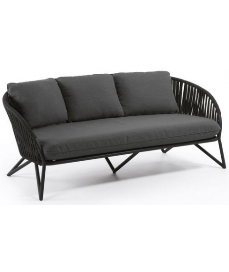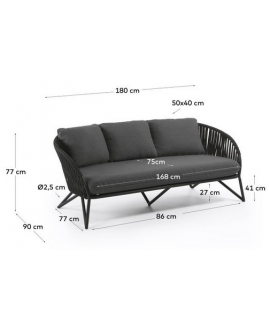 3 seater sofa with comfortable and practical functionality. Structure in black galvanized powder coated steel and processing of the armrests and backrest in polyester rope resistant to UV rays. Comfortable and well supported, seat and back kitchens covered with a beautiful practical and resistant fabric. See below the armchair to combine with the same line. In the photo of the data sheet there are all the measures.