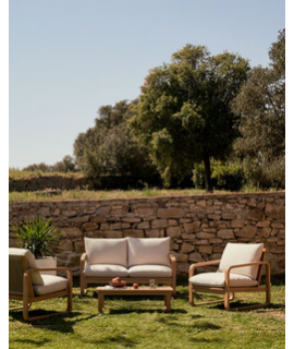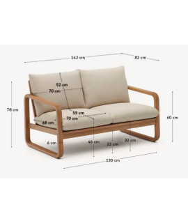 Wonderful 2 seater sofa made of solid eucalyptus wood. The furniture in this line gives a warm and elegant look to your rooms. A touch of sophistication and elegance for your indoor and outdoor conversation environment. Under other complements of the same line. All measurements are in the photo of the technical sheet.