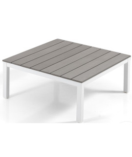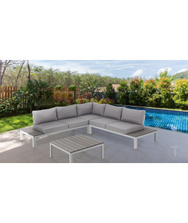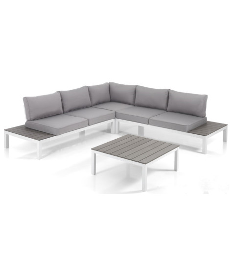 Fascinating and elegant set consisting of corner sofa and coffee table. Made of a very resistant matt white painted aluminum structure, coffee table top and sofa shelves made of Polywood with light gray walnut finish and removable and washable light gray cushions included. Versatile and refined, very refined. Of design and with a strong aesthetic impact, ideal for furnishing your outdoor spaces with style and comfortably enjoying the outdoors in your garden or terrace.