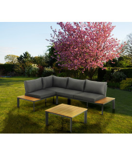 BACARD corner set 230x163 cm in aluminum and oak finish and cushions included for indoor or outdoor garden terraces