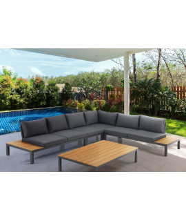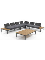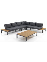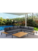 Fascinating and elegant set consisting of corner sofa and coffee table. Made of a very resistant matt grey painted aluminum structure, coffee table top and sofa shelves made of Polywood with oak finish and removable and washable gray cushions included. Versatile and refined, very refined. Of design and with a strong aesthetic impact, ideal for furnishing your outdoor spaces with style and comfortably enjoying the outdoors in your garden or terrace.