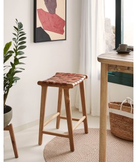 Seat made with bands of real natural brown leather, hand woven and solid wood structure for this fabulous and particular stool. The naturalness and preciousness of these elements give prestige to your environment, making it warm and welcoming.