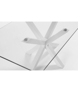 Wonderful table with cross-shaped white painted steel base and 12 mm transparent tempered glass top. Charm, design and modernity materialize in this masterpiece, which will give an undisputed touch to your environment.