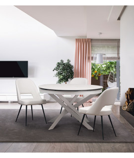 A table that stands out for its refinement, elegance and simplicity. An intriguing line of high design, completed by the use of innovative and very practical materials. Extendable top in highly resistant glass ceramic and extensions in white lacquered MDF, structure in white painted metal. Solidity and sturdiness, for a comfortable table that can be extended if necessary.