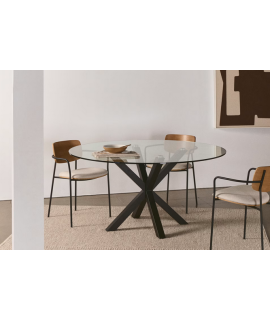 Fixed round table with large top in black glass with highly resistant to cuts and stains and cross legs in black painted metal. It is the design table to choose if you prefer a modern and elegant style at home. Suitable for all types of furniture. In the photo of the technical sheet all the measures.