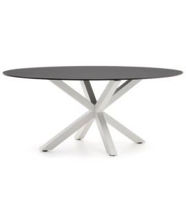 Harmonious, elegant and refined OVALE table with crossed white steel base and black tempered glass top. A truly inviting, unique and intriguing table, where design and stability characterize it. An attractive and modern look.