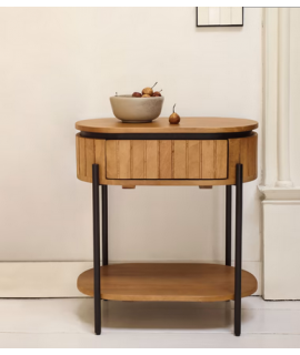 Linea accattivante per questo comodino con cassetto e doppio ripiano, elegante e prestigioso. In legno massello di mango formato da listelli accostati e piedi in metallo nero. Un meraviglioso complemento d'arredo, che trasmette luminosità all'ambiente.