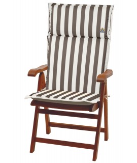 Raffinato cuscino con fantasia a righe bianche e marroni, perfetto per completare con stile il vostro arredo da giardino o terrazzo. Cuscino per poltrona alta con spalliera cm 68 h, in poliestere con il retro in tinta unita uguale al colore della riga marrone e con volant.