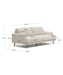 Il design del divano è accattivante, con piedini in legno massello di faggio naturale e piede centrale nascosto che dà un ottimo sostegno al divano. Grande confort e comodità nella pulizia, perchè tutti i cuscini del divano sono sfoderabili. Forte struttura in legno massello, imbottitura in schiuma di poliuretano e praticissimo rivestimento antimacchia. Portata massima 300 Kg. Tutte le misure sono nella foto della scheda tecnica.