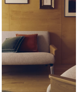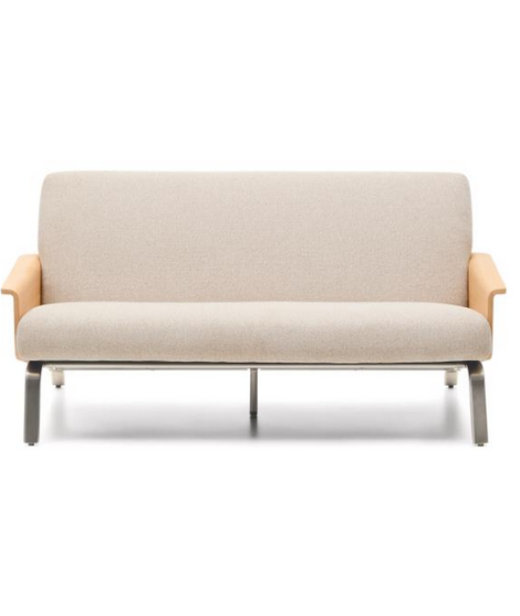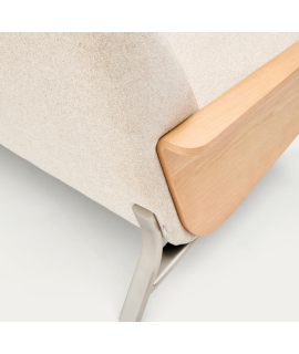 COSENZA divano 2 posti in ciniglia beige idrorepellente braccioli impiallacciato rovere e gambe in acciaio inox spazzolato