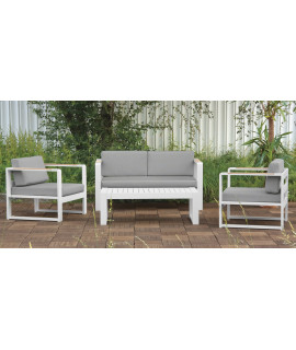 Il set salotto è composto da: 2 poltrone, 1 divano 2 posti e 1 tavolino. Con telaio in alluminio: bianco, cioccolato o tortora e cuscini rivestiti in tessuto color grigio tortora. Ideale per essere usato all'esterno in quanto i materiali sono resistentissimi alle intemperie. Una linea fresca e di design.