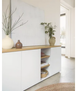 Un genere moderno, questa meravigliosa madia laccata bianca e piano impiallacciato rovere, realizzata con tre ante, con apertura push pull, dove poter riporre piatti, bicchieri, vasellame di ogni genere, e una parte di vano a vista con ripiani impiallacciato rovere, dove poter mettere gli oggettini decorativi più belli da tenere a vista. Una linea fresca e luminosa per una casa moderna, nordica, vintage, etnica o country. Sotto tutti i complementi di questa linea. Tutte le misure nella foto della scheda tecnica scorrendo con la freccetta nelle foto.