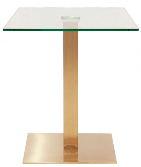 Tavolo per bar, gelaterie, caffè, ristoranti, alberghi, negozi. Realizzato con base e colonna quadrata in acciaio INOX verniciato ottone satinato e piano quadrato in vetro temperato spessore 13 mm.