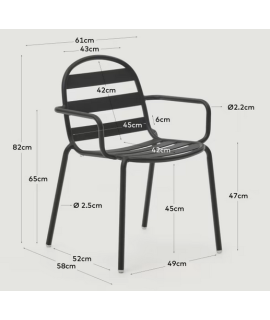 Favolosa sedia con braccioli in alluminio grigio, un materiale leggero, resistente alla corrosione, ai raggi UV, alle intemperie e alla ruggine, ideale per esterno, per abbellire il vostro giardino o terrazzo. Una sedia solida e robusta, comoda e resistente. Un affascinante stile moderno, che la rende adatta per casa, soggiorno o cucina, giardino o terrazzo e adatta anche per bistrot, bar, gelaterie, ristoranti, hotel e agriturismi. Impilabile. Vedi sotto gli altri complementi da abbinare alla stessa linea.