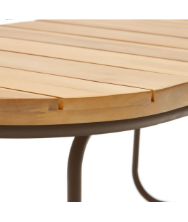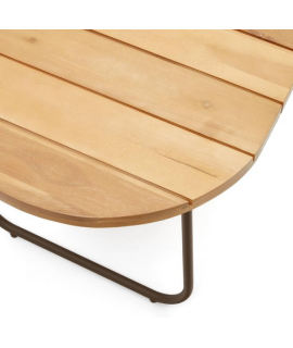 Un tavolino di design, elegante e raffinato, adatto per esterno. Comodo con piano dogato in legno massello di acacia e gambe in acciaio marrone. Una linea semplice che porta raffinatezza al vostro giardino o terrazzo. Sotto troverete i complementi della stessa linea da abbinare.