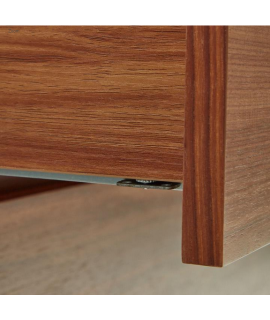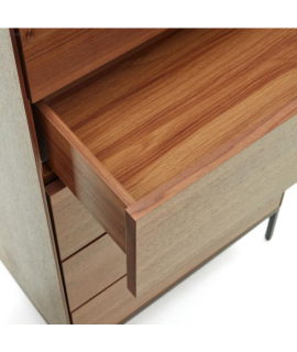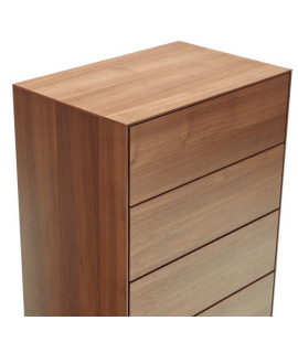 Intrigante e particolare cassettiera. Realizzato impiallacciato noce, con 5 cassetti con apertura a pressione e chiusura soft-close, con gambe regolabili in acciaio verniciato antracite opaco. Sotto troverete i complementi della stessa linea da abbinare. Tutte le misure sono nella foto della scheda tecnica.