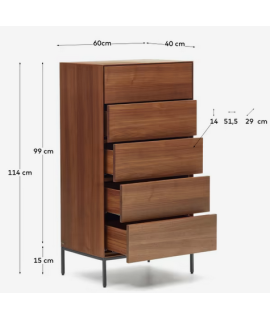 Linea accattivante per questa cassettiera elegante e prestigioso. In impiallacciato noce, con 5 cassetti con apertura a pressione e struttura in metallo antracite opaco. Un meraviglioso complemento d'arredo, che trasmette luminosità all'ambiente. Sfiziosa e raffinata, grintosa e dinamica, punta sulla praticità e su un design elegante.