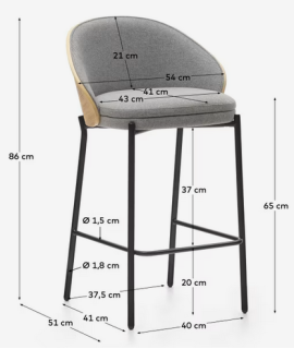 Uno sgabello dal design moderno, bello e comodo, adatto per ogni tipo di arredo. Raffinato e grintoso, ma oltre al design è anche molto confortevole. Seduta altezza 65 cm. Struttura in metallo nero opaco e impiallacciato frassino finitura naturale, imbottito con rivestimento in tessuto ciniglia grigio chiaro. Di grande prestigio e solidità. Nella foto della scheda tecnica ci sono tutte le misure scorrendo con le freccette. Sotto troverete altri complementi della stessa linea da abbinare.