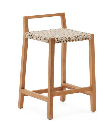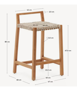 Meraviglioso sgabello dal design pulito e intrigante. Adatto per esterno, realizzato con solida struttura in legno massello di teck, seduta in corda intrecciata, trattato per esterno alle intemperie e raggi UV. Portata massima fino a 130 Kg. Nella foto della scheda tecnica troverete tutte le misure.