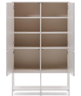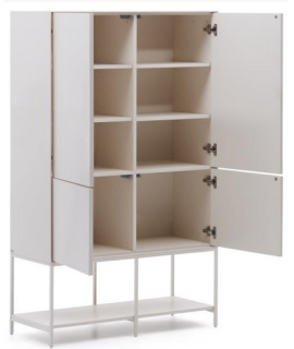 Intrigante e particolare credenza madia. Realizzata MDF laccato bianco, con 4 ante con apertura a pressione e chiusura soft-close, con gambe regolabili in acciaio verniciato bianco opaco. Sotto troverete i complementi della stessa linea da abbinare. Tutte le misure sono nella foto della scheda tecnica.