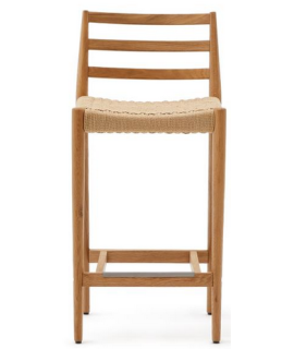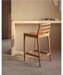 Uno sgabello elegante, dallo stile coloniale, con comodo schienale. Realizzato in legno massello di rovere con finitura naturale e corda intrecciata sulla seduta. Trasmette una piacevole sensazione di comfort e benessere all'ambiente, grazie anche alle materie prime con la quale è realizzato che conferiscono un ulteriore pregio. Adatto per esterno e per interno.