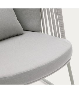 Raffinata poltrona per esterno, ispirata agli anni 50. Bella e grintosa, grazie alla resistenza e praticità del materiale con la quale è realizzata, in corda di poliestere su una struttura in acciaio e confortevoli imbottiti cuscini di seduta e di schienale, è indicata per il vostro ambiente esterno, giardino o terrazzo. Una linea affascinante per arredare con gusto e bellezza.