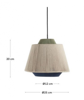 Meravigliosa lampada da soffitto con struttura in metallo verniciato e paralume in corda naturale intrecciata a mano blu, beige e verde. Predisposta per lampada (non inclusa) ad attacco grande E27 e di tipo: a basso consumo, a led oppure ad incandescenza. Tutte le misure sono nella foto della scheda tecnica.