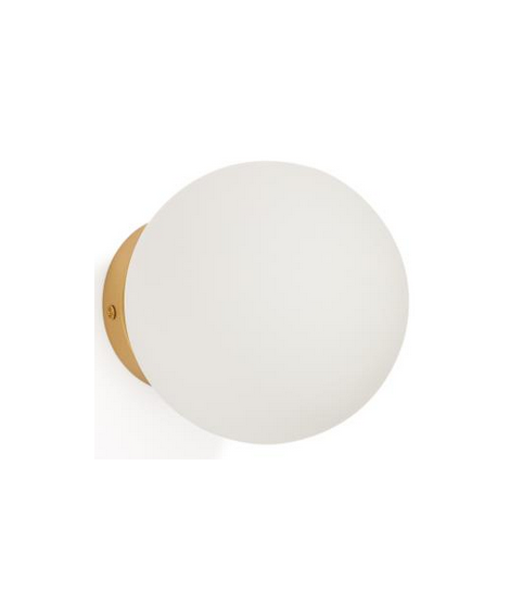 Una lampada da parete in metallo ottone e sfera in vetro che crea illuminazione attraverso una forma geometrica circolare. Perfetta per un gusto industriale, minimal, nordico, moderno, vintage. Predisposta per lampada (non inclusa) ad attacco grande E27, a basso consumo, a led oppure ad incandescenza. Classe energetica A++