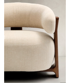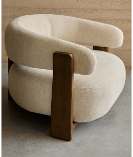LYNCH poltrona in tessuto effetto ciniglia beige e gambe in legno massello di frassino finitura noce design