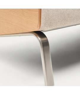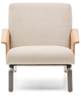 COSENZA poltrona in ciniglia beige idrorepellente braccioli impiallacciato rovere e gambe in acciaio inox spazzolato