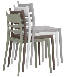 Sedia impilabile per casa o bar, gelaterie, caffè, ristoranti, locali sul lungomare, alberghi, stabilimenti balneari. Realizzata con struttura in polipropilene, scelta colore. Linea semplice ed essenziale. Perfetta per l'esterno, perchè molto resistente, pratica e maneggevole.